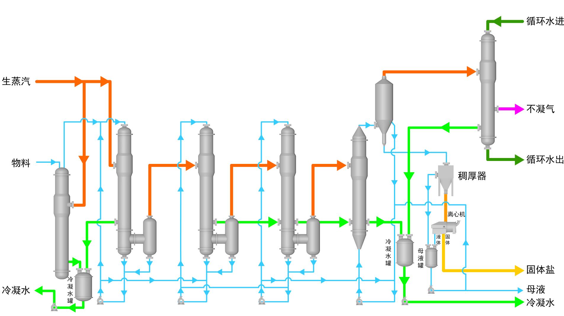 流程:順流多效、逆流多效、平流多效、并流多效和錯(cuò)流多效。