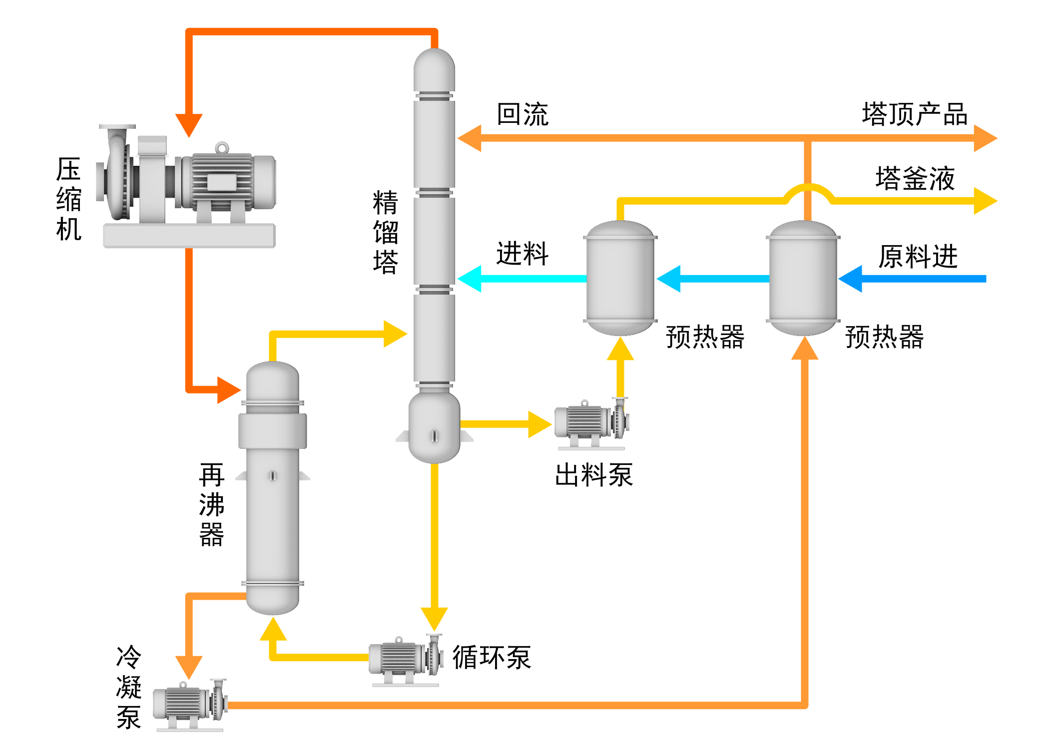 4、MVR技術(shù)可以利用少量電能回用蒸發(fā)、干燥、精餾過(guò)程的相變熱,極大地降低相關(guān)工業(yè)行業(yè)的能耗和運(yùn)行成本;