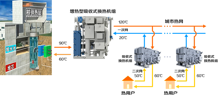 在核供熱首站,設(shè)置增熱型吸收式換熱機(jī)組將一次網(wǎng)水的供水溫度由90℃提高至120℃,輸送至城市換熱站,在保證二次網(wǎng)供熱品質(zhì)不變的前提下,經(jīng)吸收式大溫差換熱機(jī)組后將一次網(wǎng)水溫降至20℃返回核供熱首站。由于提高了一次網(wǎng)供水溫度,同時(shí)降低了一次網(wǎng)回水溫度,從而拉大了供回水溫差,可以大幅減少一次管網(wǎng)初投資費(fèi)用,降低核供熱系統(tǒng)投資成本和運(yùn)行成本。